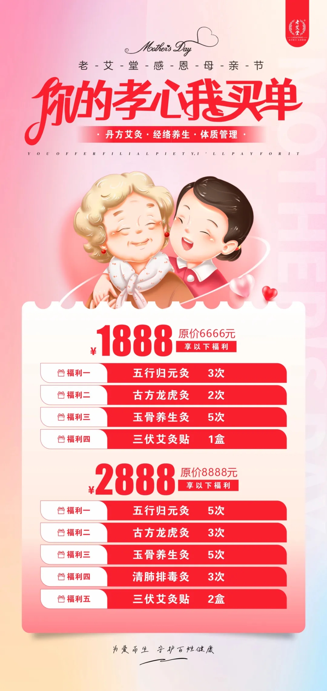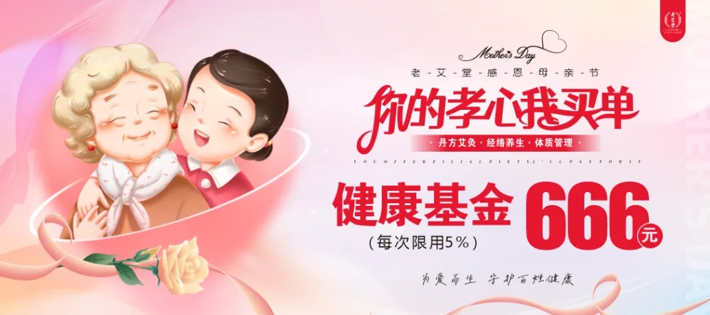 你的孝心我買單,活動期間帶媽媽進老艾堂門店,可享免費調養1次。